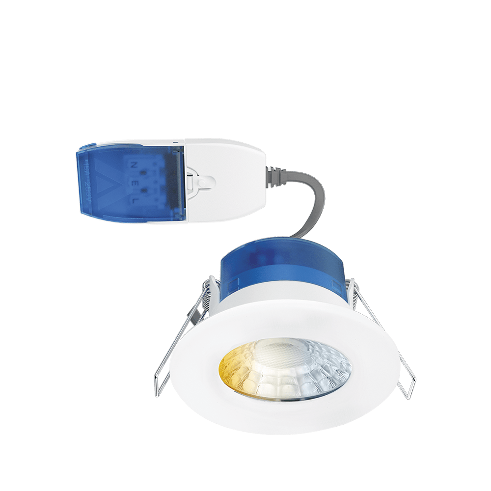 The Aurora R6™CWS is a color and wattage switchable fire-rated downlight, designed for installers and wholesalers. Equipped with a FastRFix™ connector, it ensures quick installation and circuit testing.