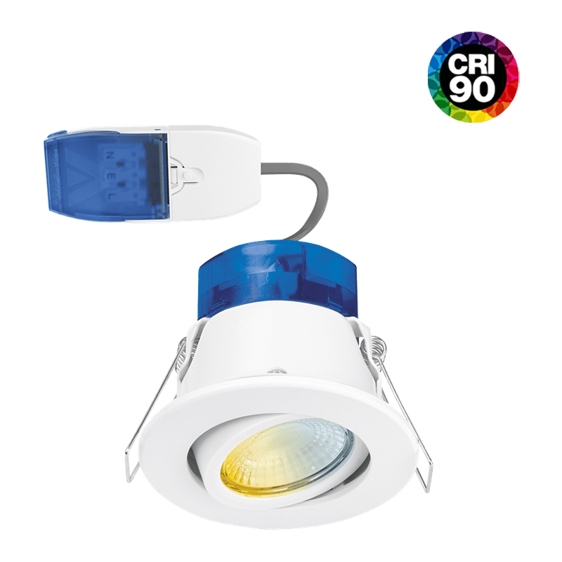 Introducing the R6™CWS CRI90 Adjustable 4-6W Colour & Wattage Switchable Fire Rated Downlight by Aurora, designed for easy installation and versatility. Equipped with a FastRFix™ connector, it allows quick setup and circuit testing, fitting perfectly in shallow ceiling voids at just 63mm high.
