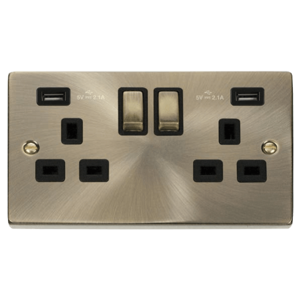 Click Scolmore's Antique Brass Deco VPAB580BK switches and sockets feature a contemporary, square edge profile designed to look incredible against any style of interior décor. The entire Deco range is manufactured to a high specification and all sockets and FCUs are tested and approved to BS1363. The Antique Brass range is manufactured from stainless steel. All Click Deco switches are modular in design, and therefore can be customised with alternate switches if needed. • 2 gang switched socket with 2x USB outlets. • Socket rating: 13A - Total USB rating: 4.2A • Redesigned USB ports offer 5V 2.1A per port. • Minimum back box depth: 25mm • Twin Earth terminals. • Antique brass finish with black inserts and ingot switches • IP20 rated. • Plate dimensions (H x W x D): 88 x 146 x 8mm. • In-line terminals and large chamfered terminal entries for easy installation • 10 Year WarrantyDownloads