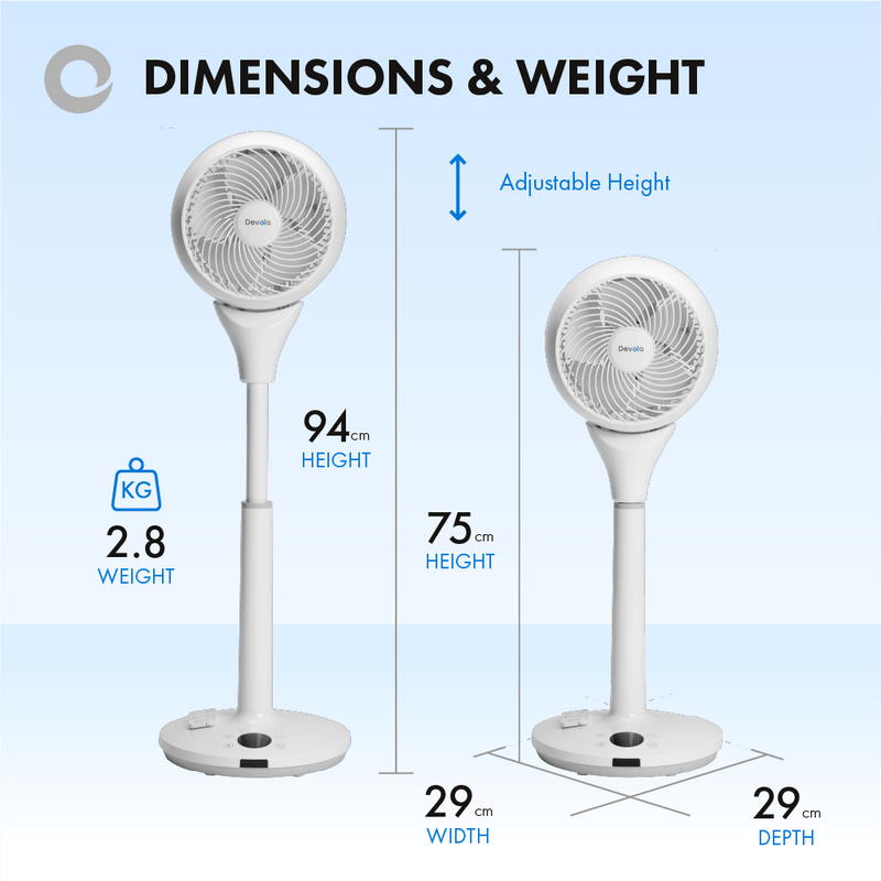 PORTABLE & POWERFUL: With an air flow of 9.42m³/min and a wind speed of 6m/s at maximum capacity, it’s fair to say that the Devola 9” pedestal fan is powerful. Combined with dimensions (including an adjustable height) of (W)290 x (D)290 x (H)750~940mm and a weight of 2.8Kg, brought together by the addition of a carry handle for further ease of movement.
