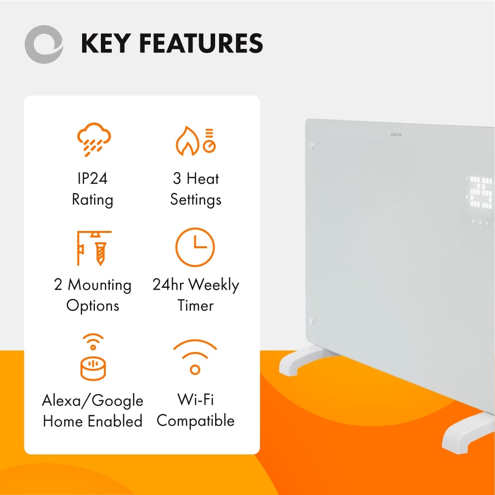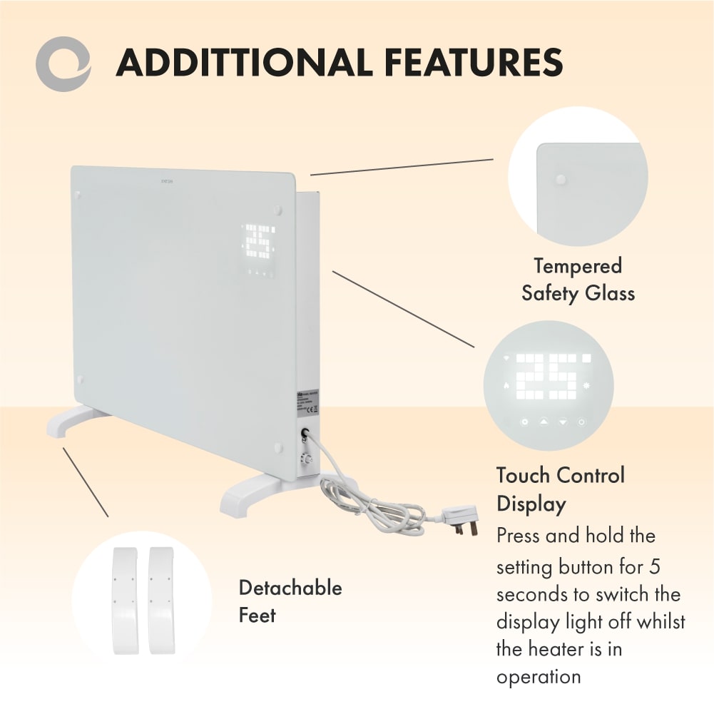 Versatility is important. With the included optional feet, you have the choice of wall or floor mounted options for your panel heater. Also featuring contemporary tempered front safety glass for exceptional safety along with modern style.