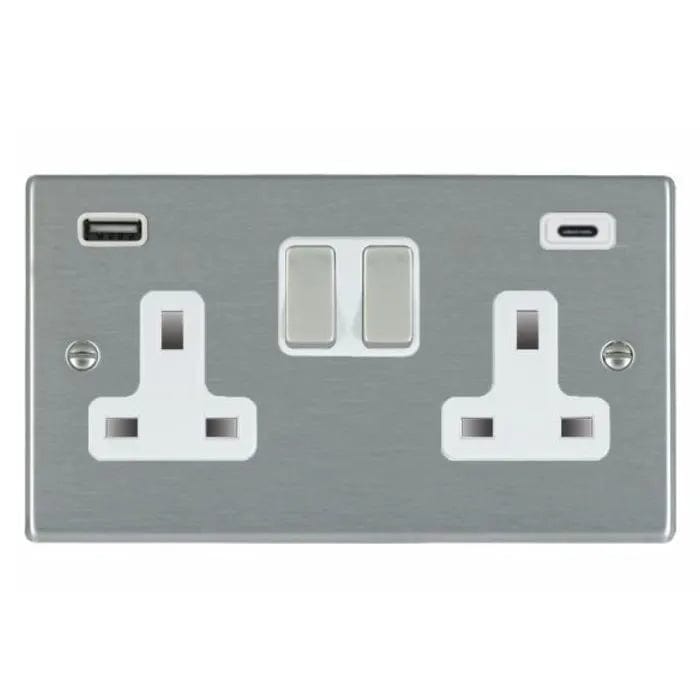 Hamilton Hartland 13A 2 Gang Type A/C USB Socket with 2 x USB - 4.8A - Satin Steel/White Inserts - 74SS2USBCSS-W