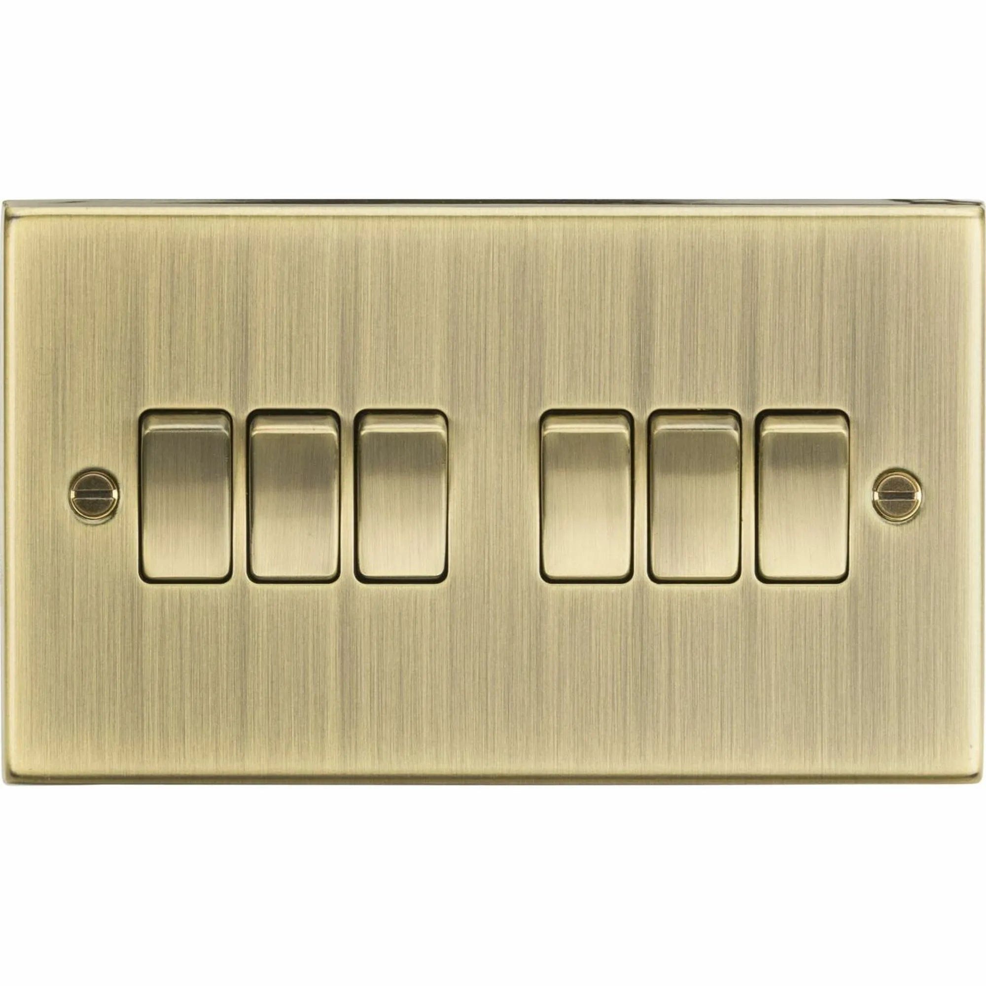 This 6-gang 2-way switch is designed for reliability and ease of use, allowing you to control multiple lighting points from two different locations. The robust construction and high-quality materials ensure durability and long-lasting performance, making it suitable for both residential and commercial applications. The antique brass finish not only enhances its aesthetic appeal but also provides resistance to wear and tear.