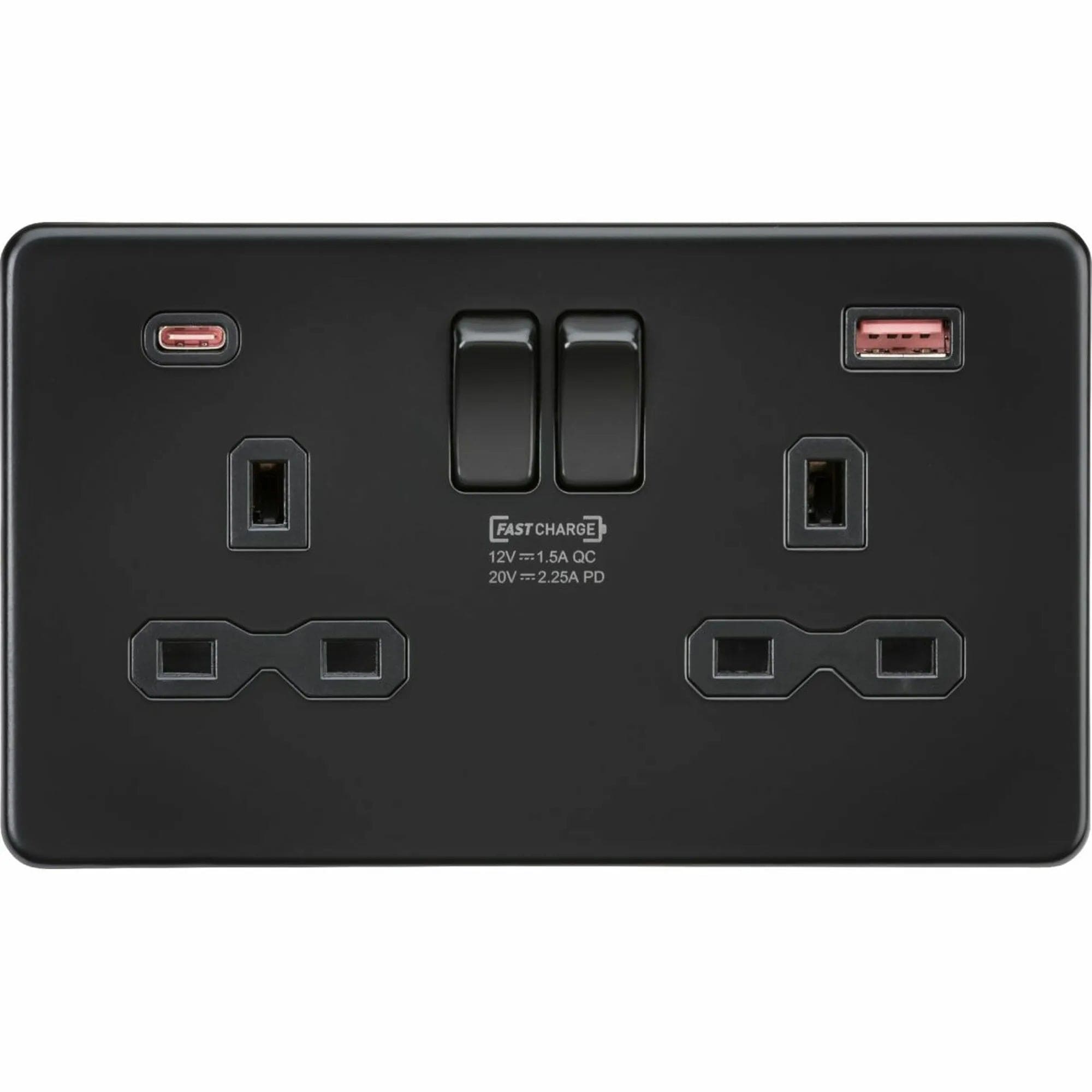 Knightsbridge 13A 2G DP Switched Socket with Dual USB A+C 20V DC 2.25A (Max. 45W) - Matt Black with Black Insert