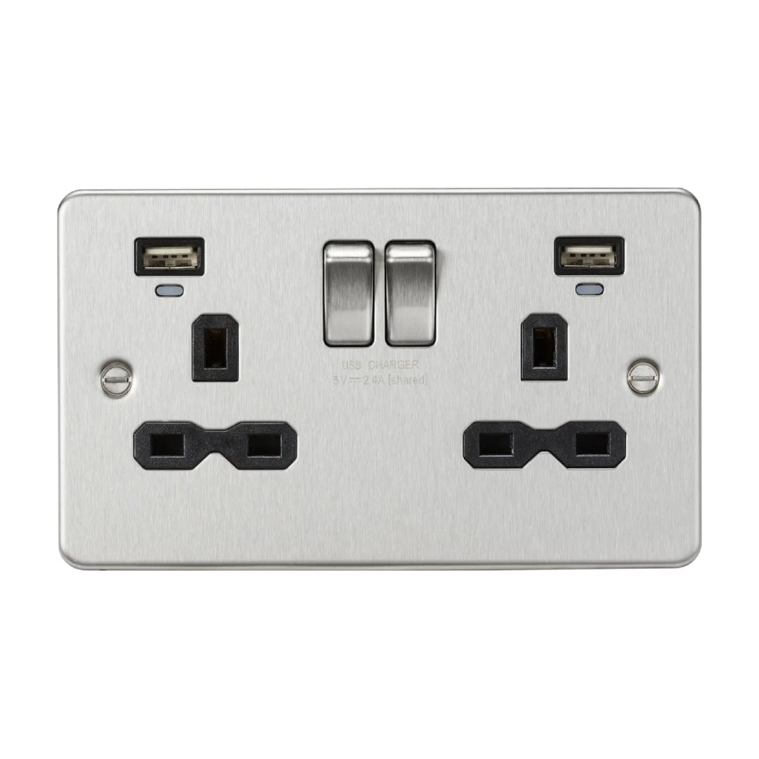 Knightsbridge 13A 2G Switched Socket, Dual USB (2.4A) with LED Charge Indicators - Brushed Chrome w/black insert - FPR9904NBC