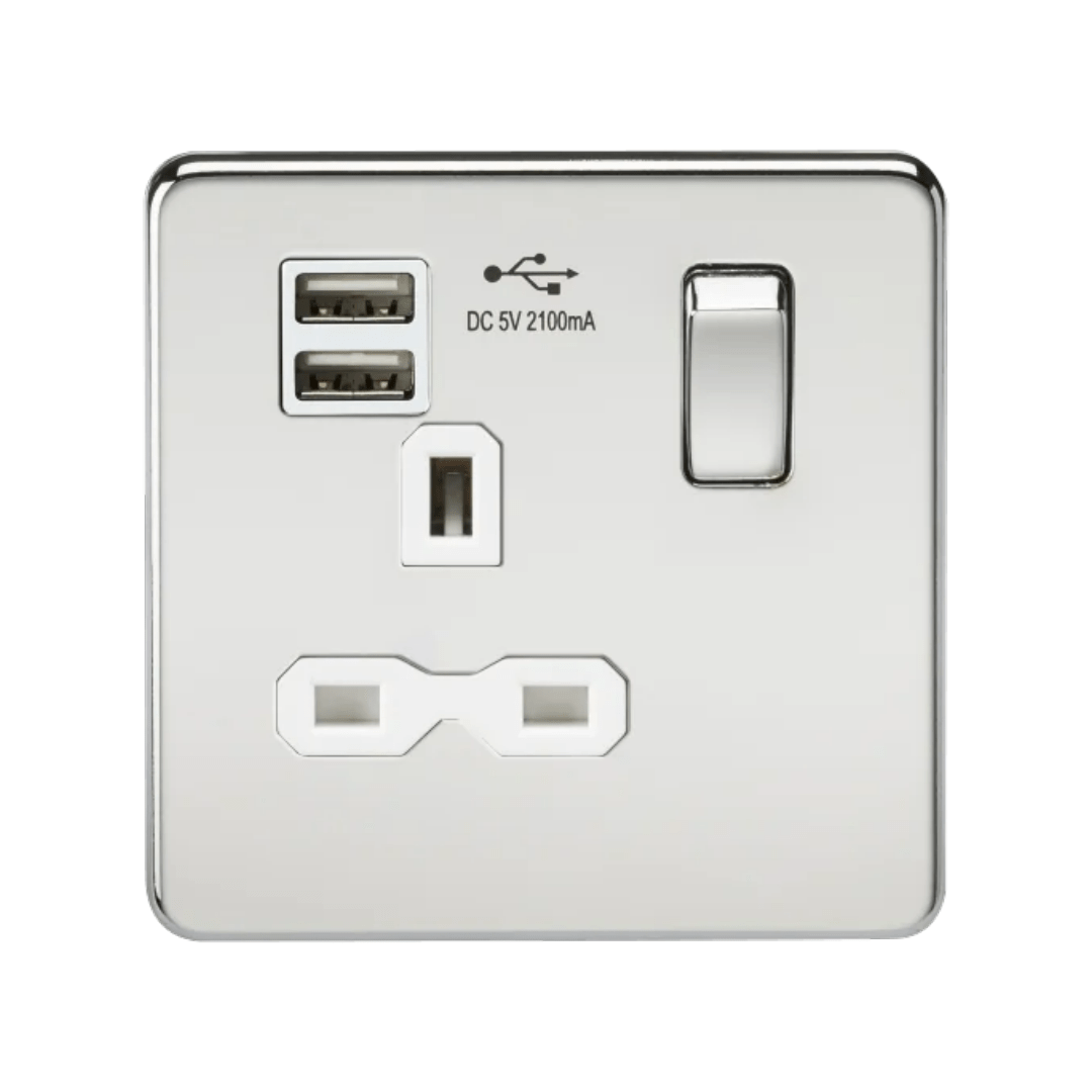 Enhance your power outlets with the Screwless 13A 1G switched socket with dual USB charger. This polished chrome unit with a white insert combines modern aesthetics with high functionality. The screwless design offers a clean and sophisticated look, making it a perfect fit for contemporary interiors. The 13A switched socket provides reliable power distribution, while the dual USB charger offers a convenient way to charge your devices. Its polished chrome finish adds a touch of elegance, while the white insert provides a striking contrast, enhancing the overall aesthetic appeal. Constructed from premium materials, this socket is built to last. Easy to install and maintain, the Screwless 13A 1G switched socket with dual USB charger is a practical and stylish addition to any space. Whether you're upgrading your home or outfitting a commercial space, this socket provides the reliability and performance you need.Specification