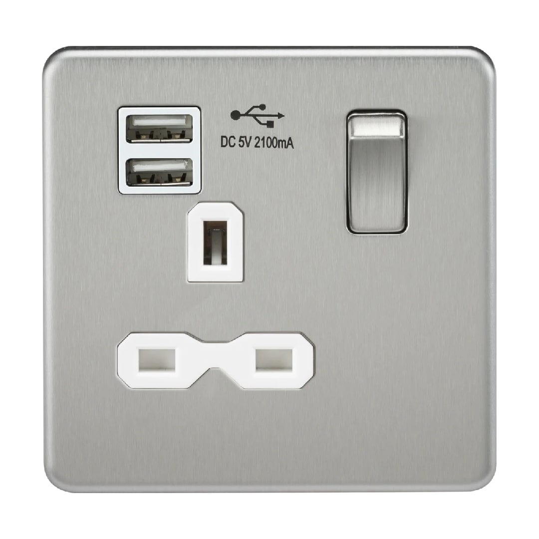 The Knightsbridge Screwless 13A 1G Switched Socket with Dual USB Charger (2.1A) in Brushed Chrome with White Insert is a stylish and practical addition to any modern home or office. Its brushed chrome finish and white insert provide a sleek and contemporary look that enhances any interior décor. The dual USB charger adds convenience, allowing you to charge your devices without occupying the socket.