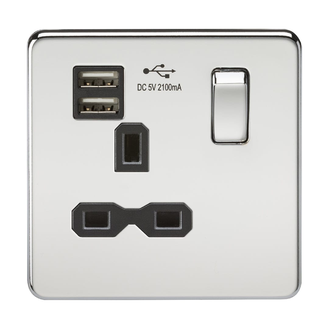 The Knightsbridge Screwless 13A 1G Switched Socket with Dual USB Charger (2.4A) in Polished Chrome with Black Insert is a stylish and practical addition to any modern home or office. Its polished chrome finish and black insert provide a sleek and contemporary look that enhances any interior décor. The dual USB charger adds convenience, allowing you to charge your devices without occupying the socket.