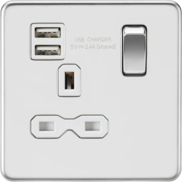 Knightsbridge Screwless 13A 1G switched socket with dual USB charger (2.4A) - polished chrome with white insert - SFR9124PCW