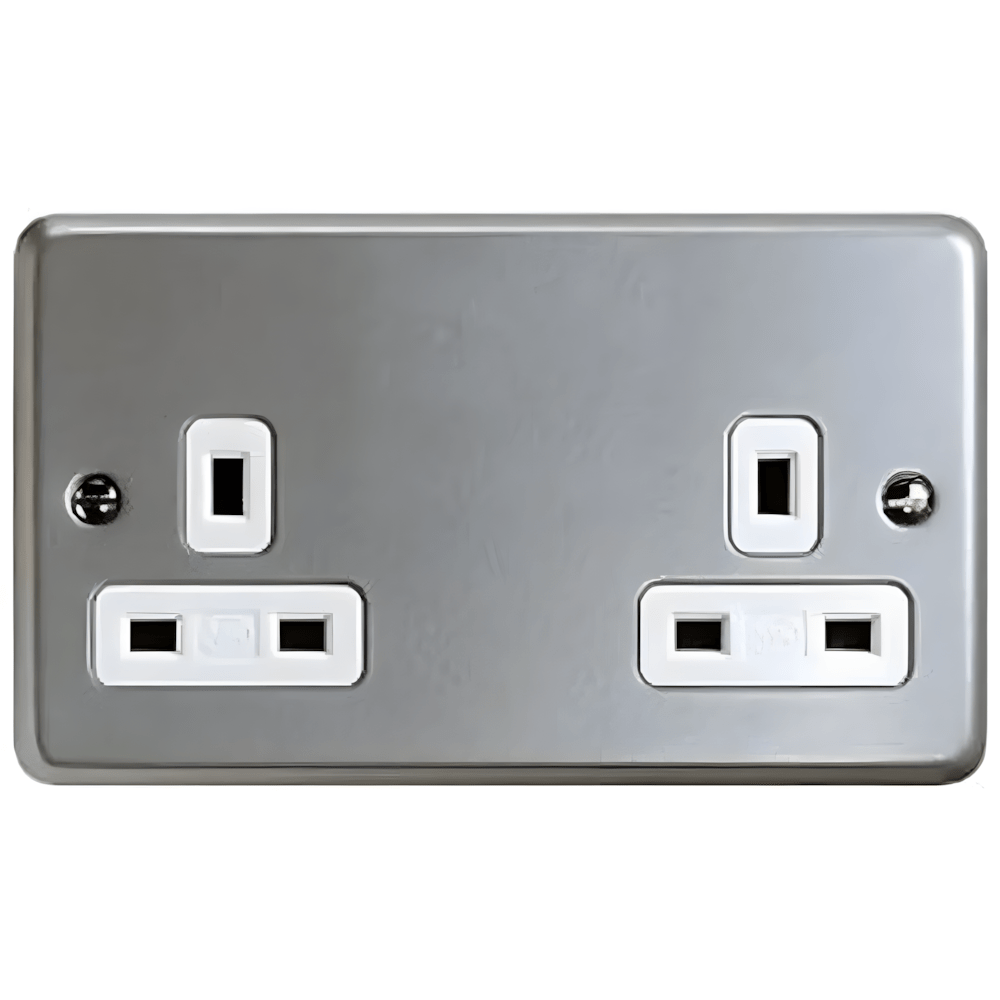 This unswitched socket features dual earth terminals, providing a high integrity protective connection as specified within BS 7671: 2008. The scratch-resistant metallic powder finish enhances its durability and resistance to impact, ensuring it maintains its appearance over time. The socket comes complete with a back box that includes multiple knockouts for easy installation and wiring, making it a convenient and practical choice for various settings.