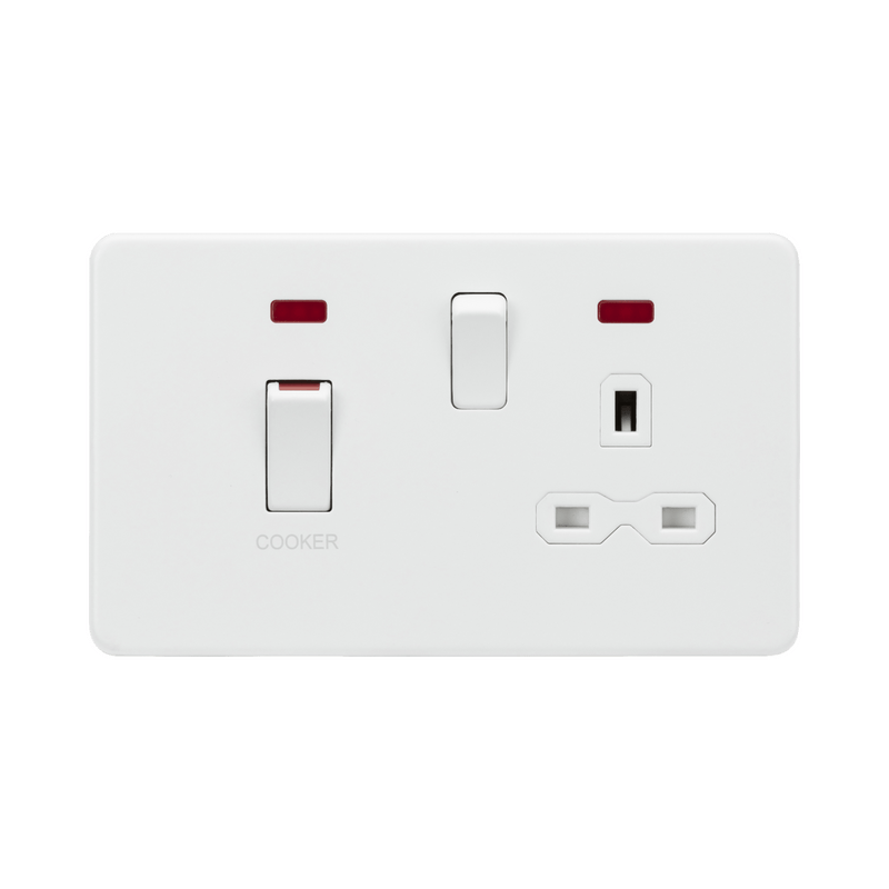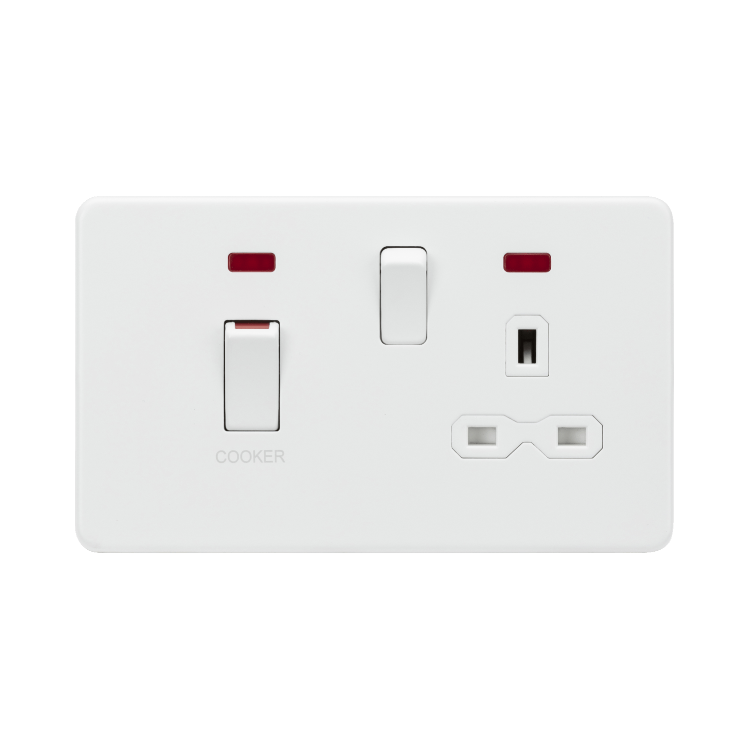 Cooker control units enable isolation of the unit so that maintenance and repairs to be carried out separately. The unit can be switched off, preventing the appliance from being turned on accidentally - for example whilst cleaning. Control two or more cooking appliances in the same room, providing rating is sufficient. This model combines a 45A switch with a 13A socket. Flawless Screwless design.