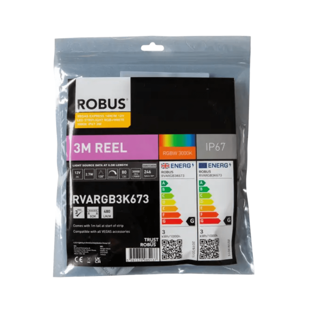 Illuminate your surroundings with the Robus Vegas 14W/m 3m LED Striplight IP67, RGB / 3000K (RVARGB3K673). This versatile LED strip offers vibrant RGB colors paired with a warm 3000K white light, ideal for creating inviting and dynamic lighting effects. With a powerful 14W per meter output and a 3-meter length, it ensures bright and efficient illumination. The IP67 rating guarantees waterproof performance, making it perfect for both indoor and outdoor applications. Easy to install and highly flexible, the Robus Vegas LED Striplight is ideal for accent lighting, landscaping, and more. Transform your spaces with reliable and stylish lighting.