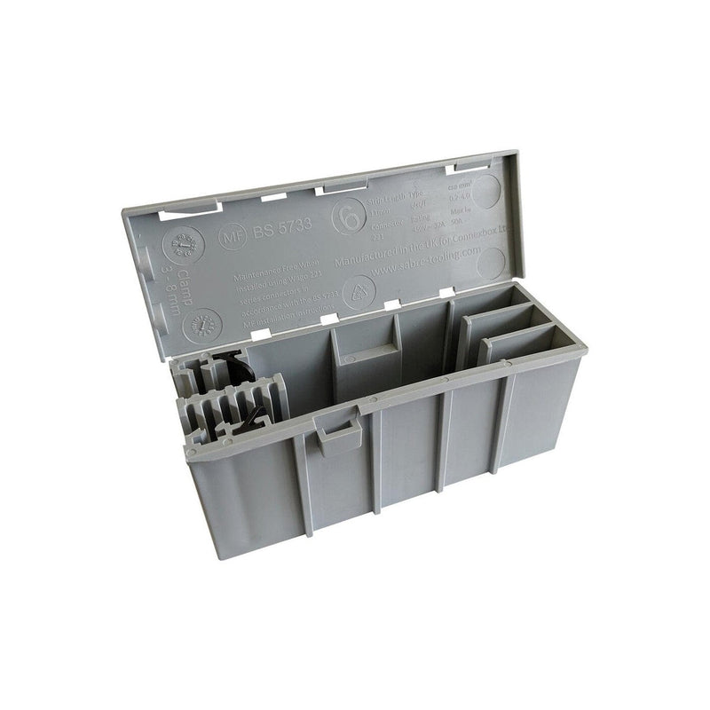 This Wago junction box enclosure can support conductor sizes from 0.2mm² to 4mm². The maximum number of supported individual conductor connections is 20. Each cable clamp can grip cables with an overall diameter between 3mm and 8mm.