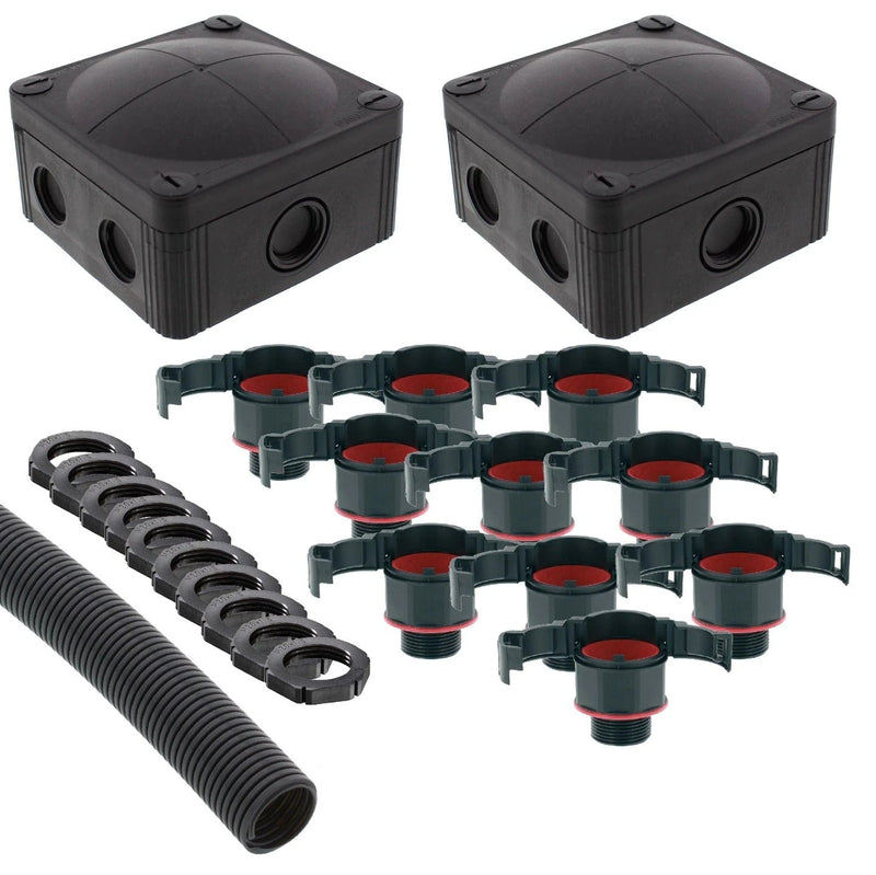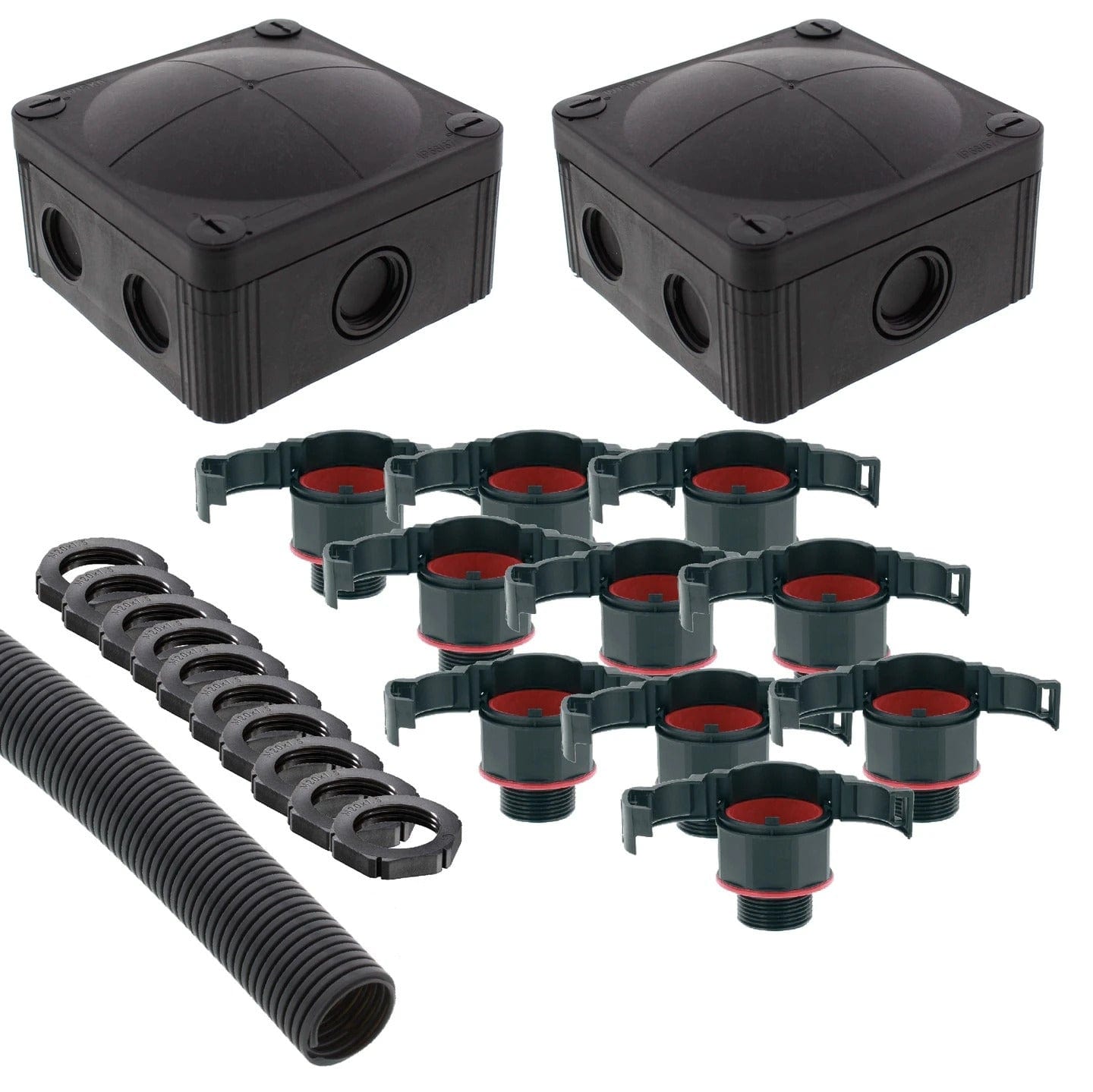 The Wiska 10110231 is a conduit contractor pack which includes ten EBFS IP68 glands, two COMBI 407 boxes, 10m conduit and ten 20mm nuts. Featuring a hinged cover for quick and easy opening, this product has integrated strain relief and a directly injected O-ring which ensures secure installation and perfect sealing properties.